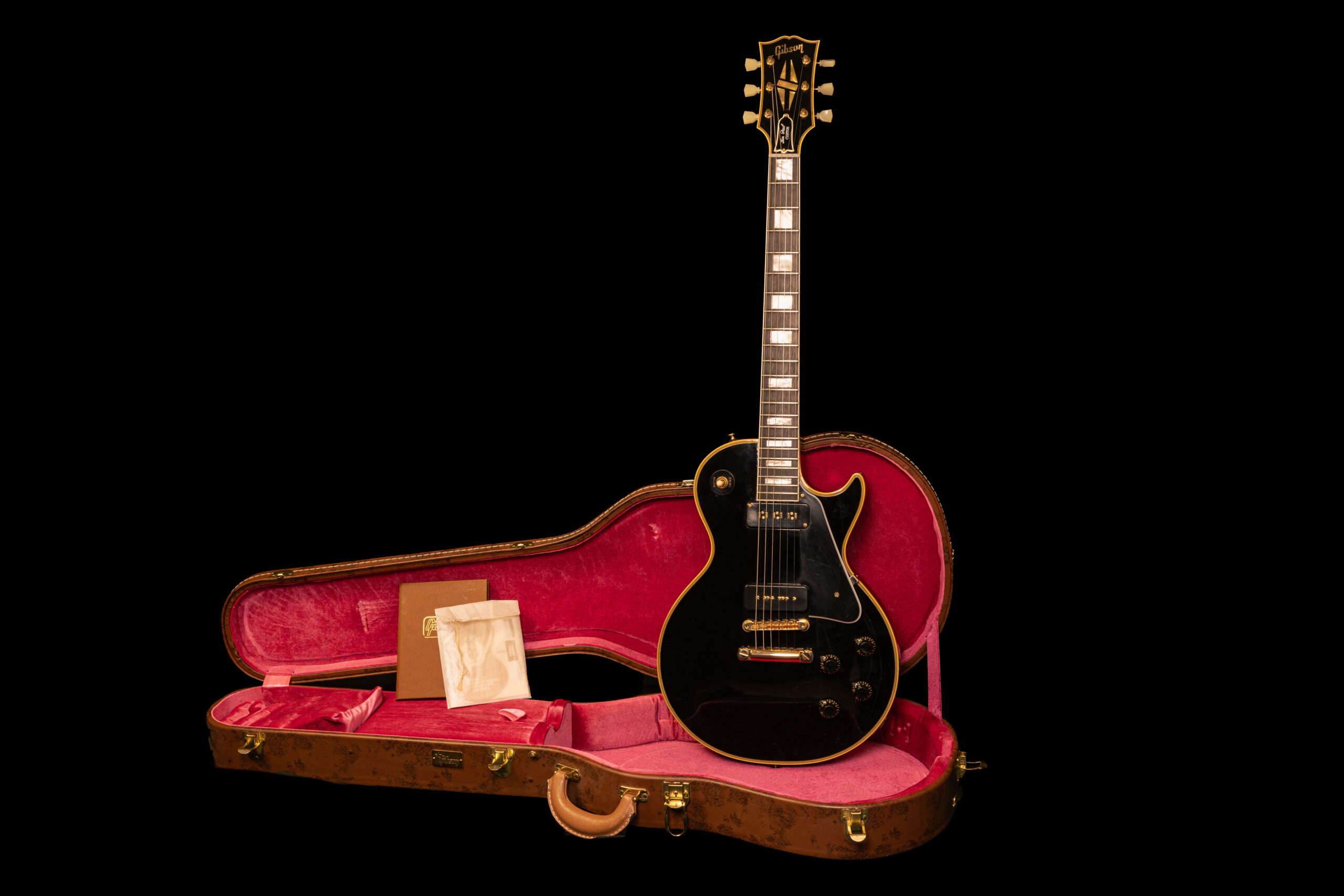 Reissue of the 1954 Les Paul Custom with the legendary Alnico-V neck pickup and one piece Mahogany body. The Les Paul suffered a broken headstock, but was repaired flawlessly by our guitar mechanic.
